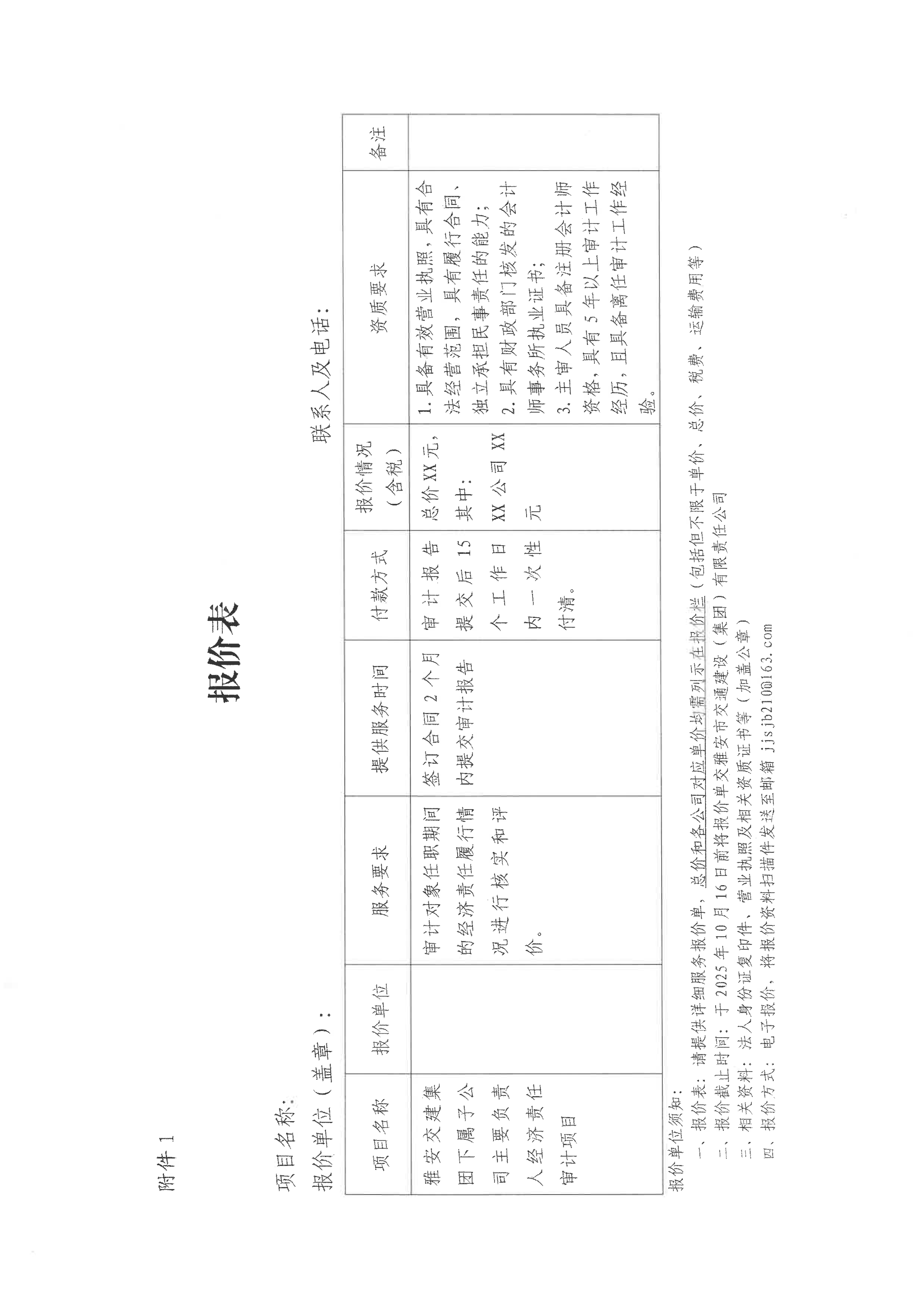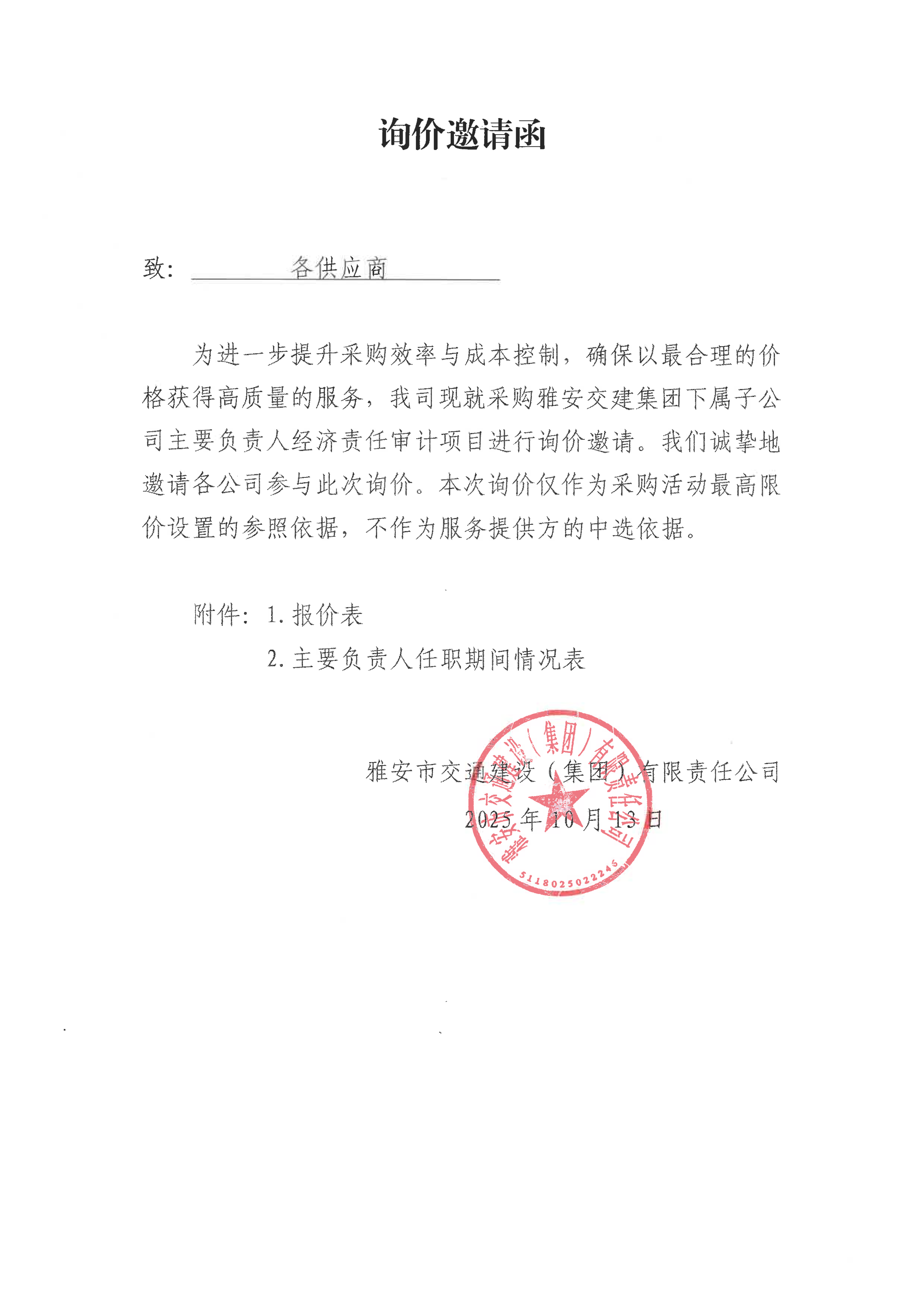 關(guān)于雅安交建集團下屬子公司主要負責人經(jīng)濟責任審計項目限價的詢價函
