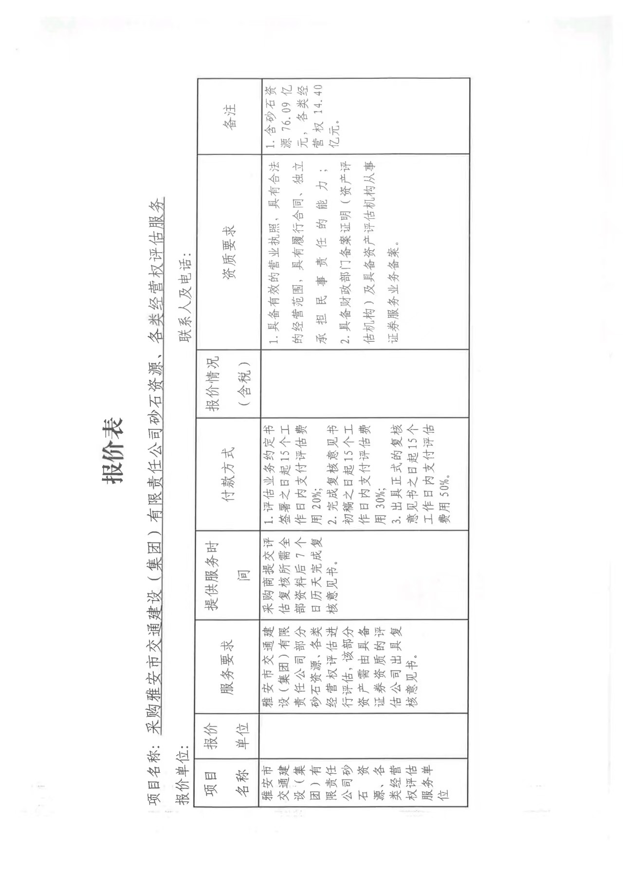 關(guān)于雅安市交通建設(shè)(集團(tuán))有限責(zé)任公司砂石資源、各類經(jīng)營(yíng)權(quán)評(píng)估服務(wù)限價(jià)的詢價(jià)函