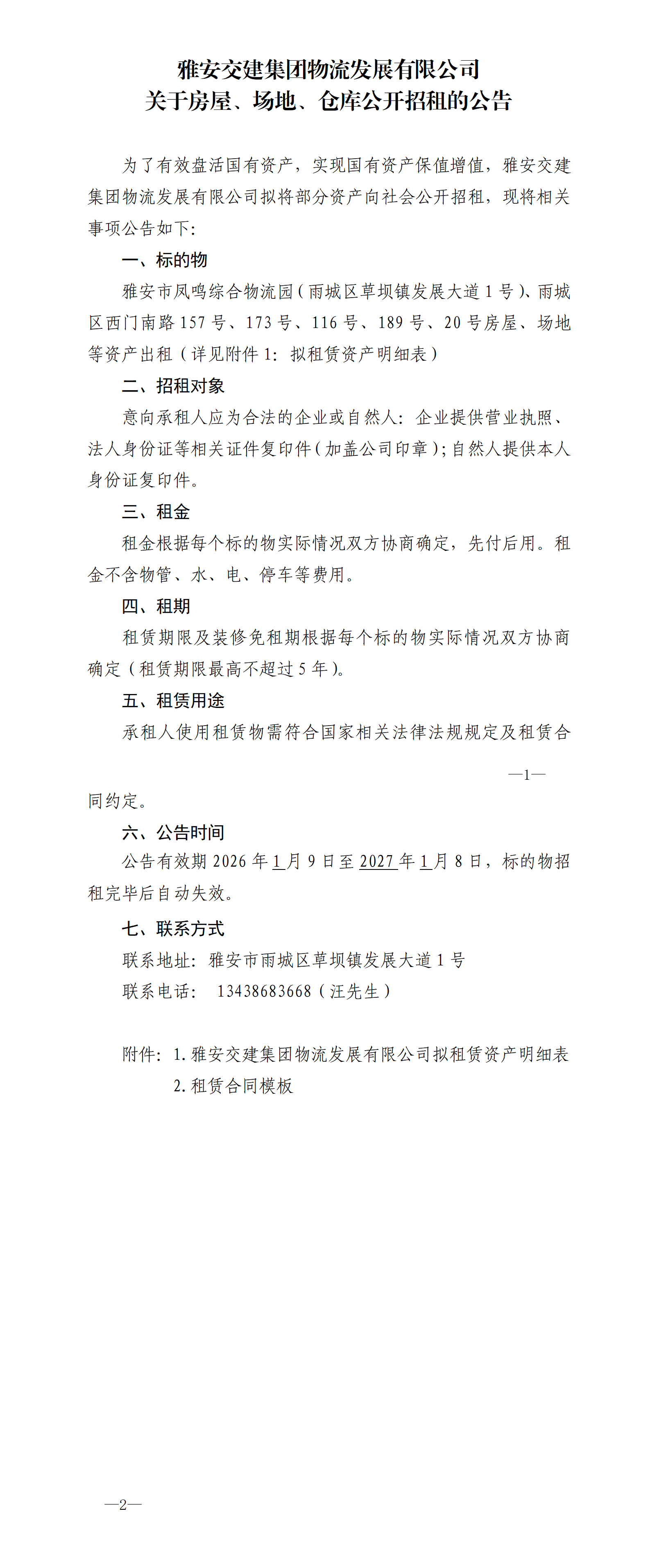 雅安交建集團物流發(fā)展有限公司關于房屋、場地、倉庫公開招租的公告