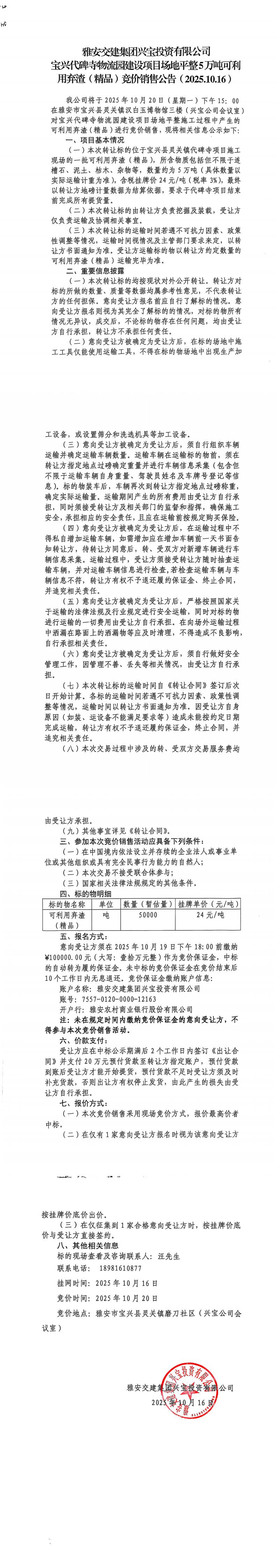 雅安交建集團(tuán)興寶投資有限公司寶興代碑寺物流園建設(shè)項(xiàng)目場地平整5萬噸可利用棄渣(精品)競價(jià)銷售公告(2025.10.16)