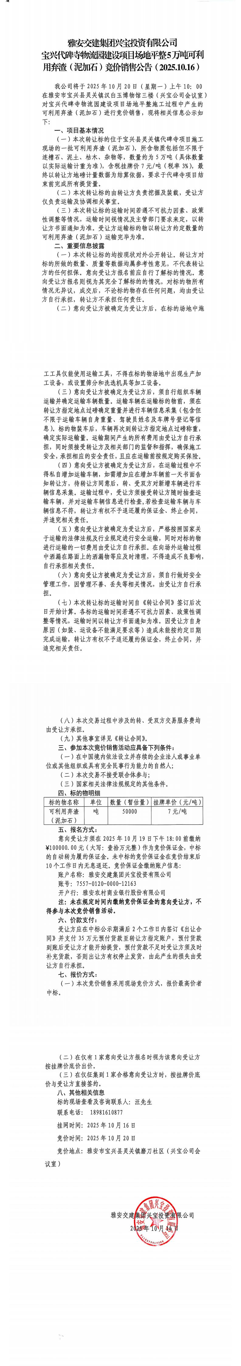 雅安交建集團興寶投資有限公司寶興代碑寺物流園建設(shè)項目場地平整5萬噸可利用棄渣(泥加石)競價銷售公告(2025.10.16)