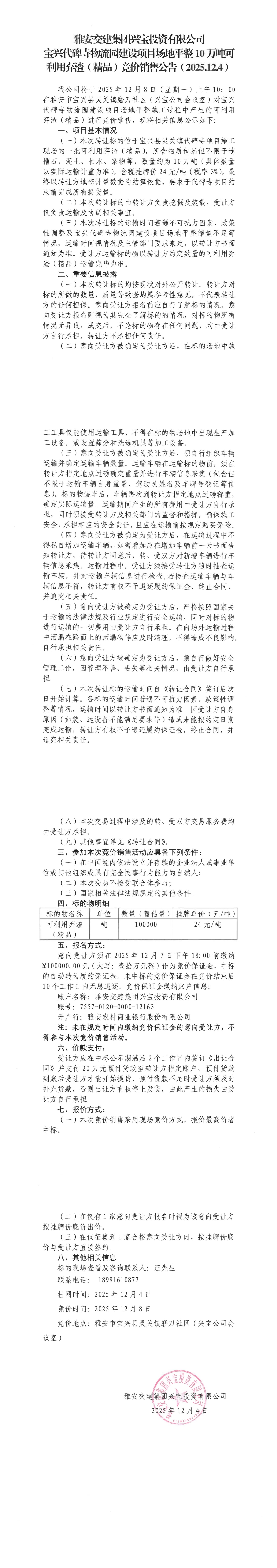 雅安交建集團(tuán)興寶投資有限公司10萬(wàn)噸可利用棄渣(精品)競(jìng)價(jià)銷售掛網(wǎng)公告(2025.12.04)